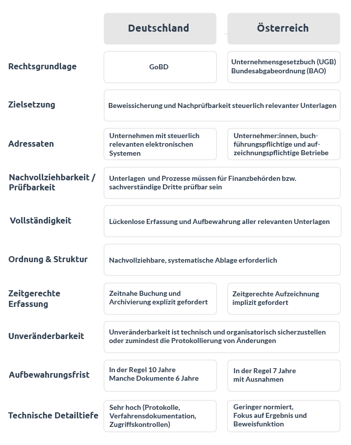 Die deutschen GoBD sind technischer und detaillierter, die österreichischen UGB/BAO prinzipienorientierter. In der Praxis nähern sich die Anforderungen stark an: wer GoBD-konform archiviert, erfüllt in der Regel auch die österreichischen Vorgaben – umgekehrt gilt dies allerdings nicht automatisch!